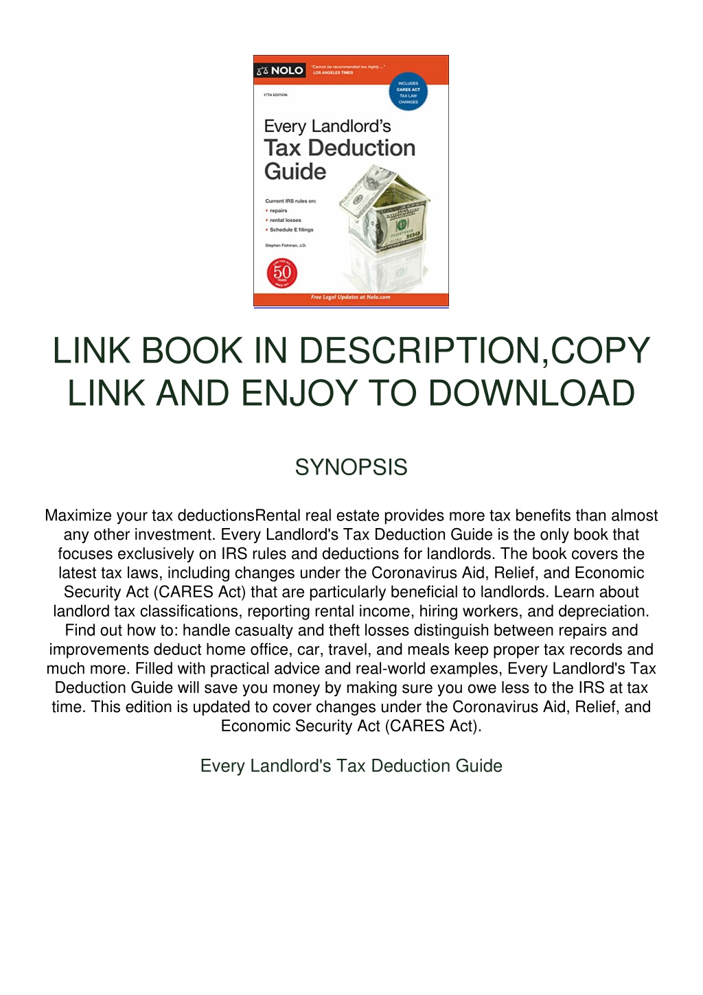 LINK BOOK IN DESCRIPTION,COPY LINK AND ENJOY TO DOWNLOAD SYNOPSIS Maximize your tax deductionsRental real estate provides more tax benefits than almost any other investment. Every Landlord's Tax Deduction Guide is the only book that focuses exclusively on IRS rules and deductions for landlords. The book covers the latest tax laws, including changes under the Coronavirus Aid, Relief, and Economic Security Act (CARES Act) that are particularly beneficial to landlords. Learn about landlord tax classifications, reporting rental income, hiring workers, and depreciation. Find out how to: handle casualty and theft losses distinguish between repairs and improvements deduct home office, car, travel, and meals keep proper tax records and much more. Filled with practical advice and real-world examples, Every Landlord's Tax Deduction Guide will save you money by making sure you owe less to the IRS at tax time. This edition is updated to cover changes under the Coronavirus Aid, Relief, and Economic Security Act (CARES Act). Every Landlord's Tax Deduction Guide