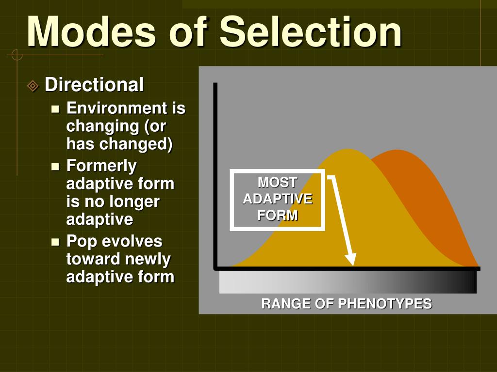Modes of Selection • Directional • Environment is changing (or has changed) • Formerly adaptive form is no longer adaptive • Pop evolves toward newly adaptive form MOST ADAPTIVE FORM RANGE OF PHENOTYPES