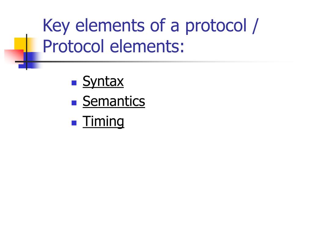 Key elements of a protocol / Protocol elements: • Syntax • Semantics • Timing