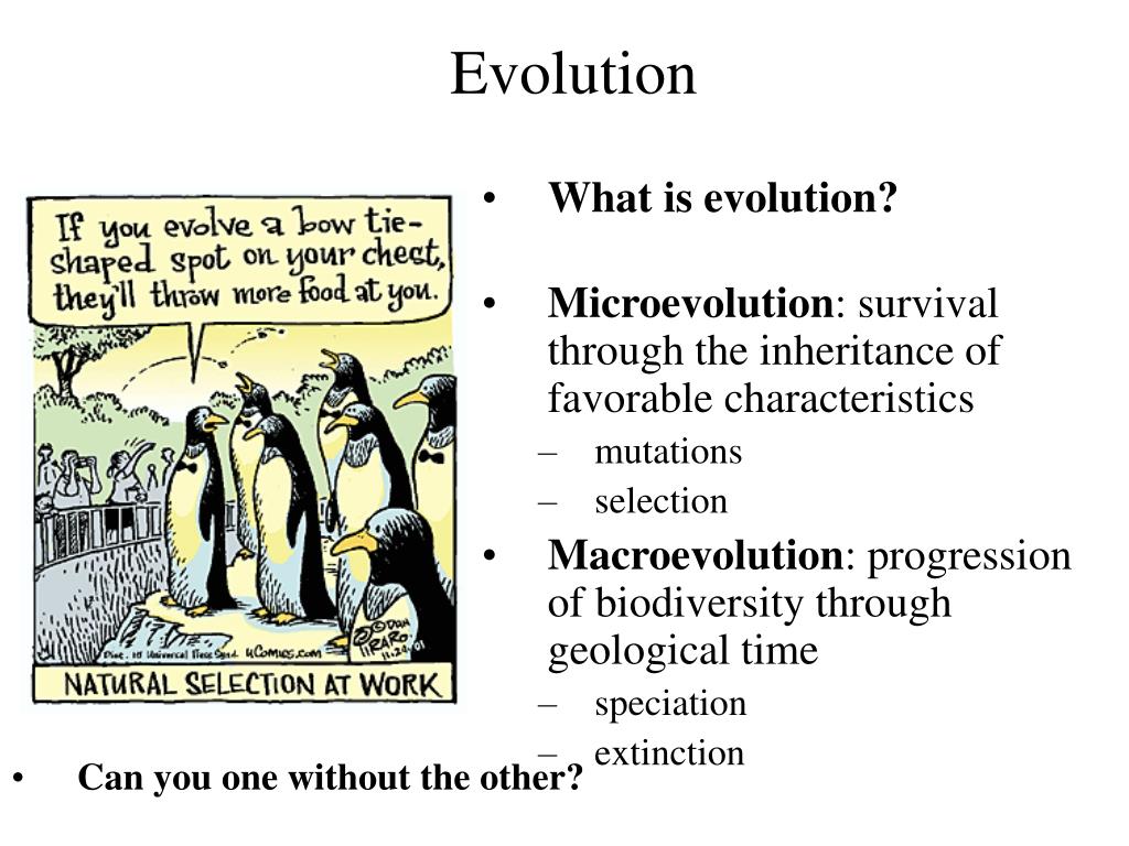 Evolution • What is evolution? • Microevolution: survival through the inheritance of favorable characteristics • mutations • selection • Macroevolution: progression of biodiversity through geological time • speciation • extinction • Can you one without the other?