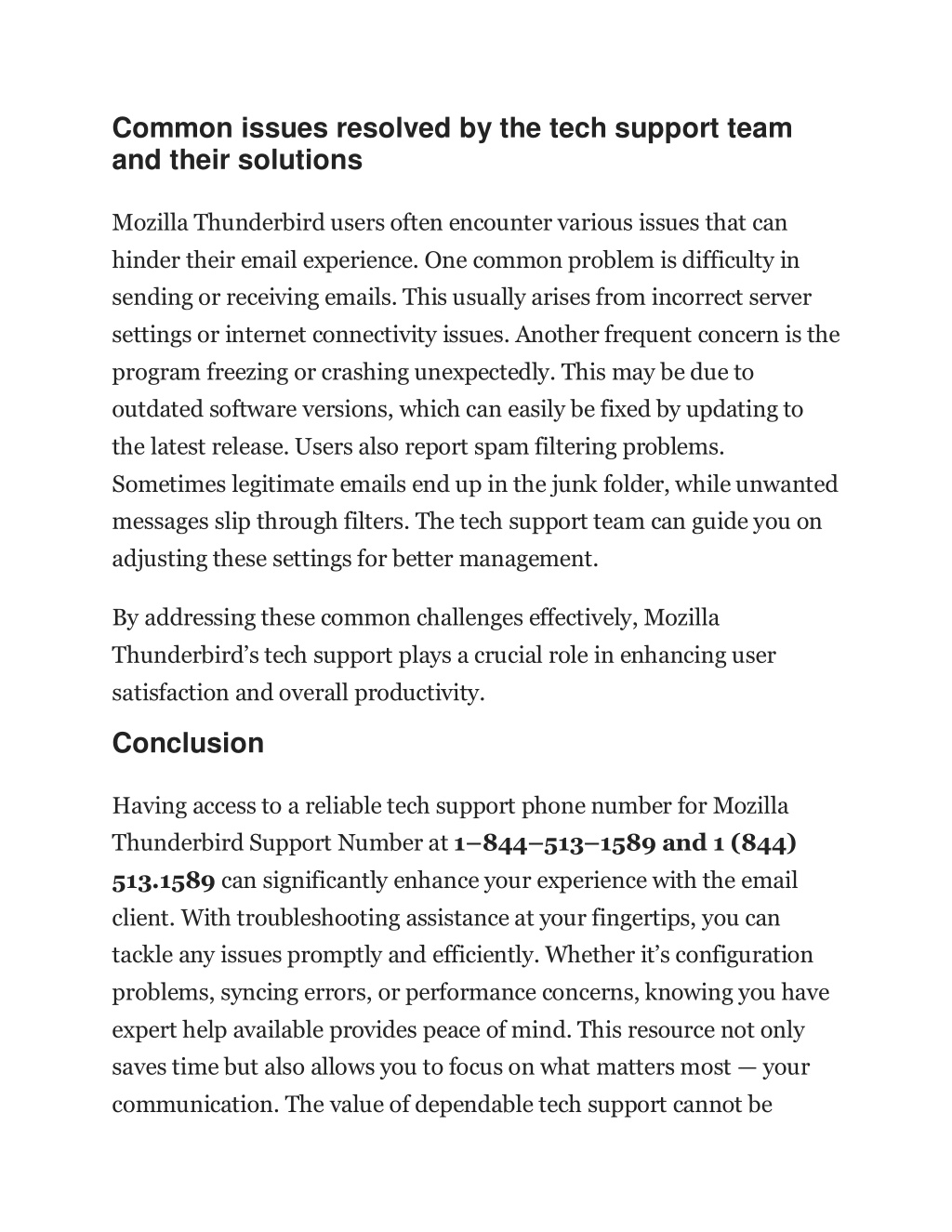 4. Common issues resolved by the tech support team and their solutions Mozilla Thunderbird users often encounter various issues that can hinder their email experience. One common problem is difficulty in sending or receiving emails. This usually arises from incorrect server settings or internet connectivity issues. Another frequent concern is the program freezing or crashing unexpectedly. This may be due to outdated software versions, which can easily be fixed by updating to the latest release. Users also report spam filtering problems. Sometimes legitimate emails end up in the junk folder, while unwanted messages slip through filters. The tech support team can guide you on adjusting these settings for better management. By addressing these common challenges effectively, Mozilla Thunderbird’s tech support plays a crucial role in enhancing user satisfaction and overall productivity. Conclusion Having access to a reliable tech support phone number for Mozilla Thunderbird Support Number at 1–844–513–1589 and 1 (844) 513.1589 can significantly enhance your experience with the email client. With troubleshooting assistance at your fingertips, you can tackle any issues promptly and efficiently. Whether it’s configuration problems, syncing errors, or performance concerns, knowing you have expert help available provides peace of mind. This resource not only saves time but also allows you to focus on what matters most — your communication. The value of dependable tech support cannot be