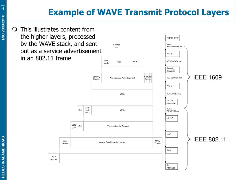 This illustrates content from the higher layers, processed by the WAVE stack, and sent out as a service advertisement in an 802.11 frame Example of WAVE Transmit Protocol Layers IEEE 1609 IEEE 802.11