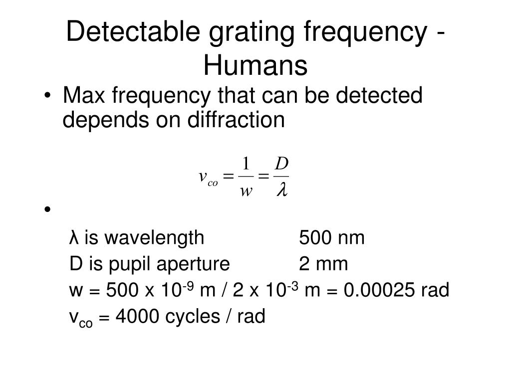 Detectable grating frequency - Humans • Max frequency that can be detected depends on diffraction • λis wavelength 500 nm D is pupil aperture2 mm w = 500 x 10-9 m / 2 x 10-3 m = 0.00025 rad vco = 4000 cycles / rad