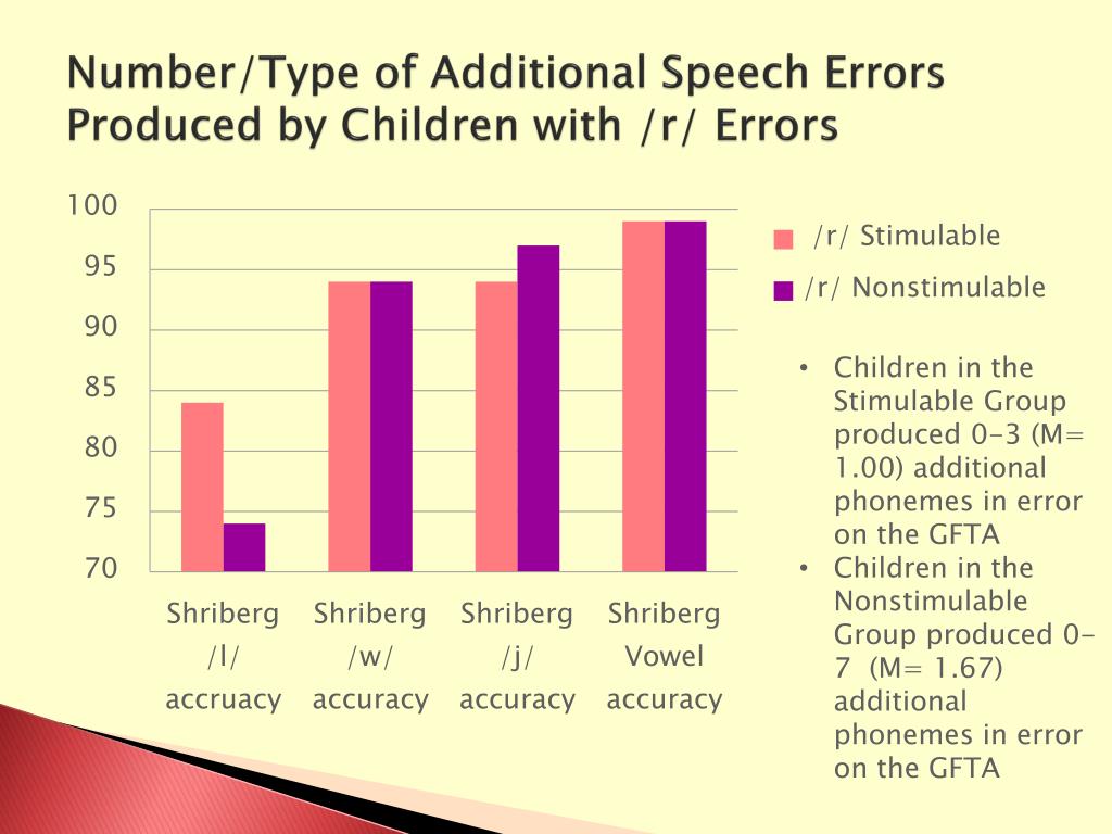 Number/Type of Additional Speech Errors Produced by Children with /r/ Errors • Children in the Stimulable Group produced 0-3 (M= 1.00) additional phonemes in error on the GFTA • Children in the Nonstimulable Group produced 0-7 (M= 1.67) additional phonemes in error on the GFTA