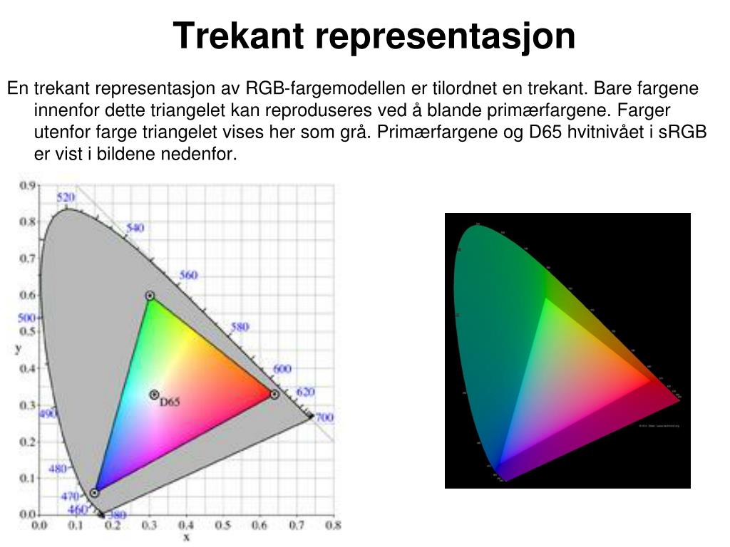 Trekant representasjon En trekant representasjon av RGB-fargemodellen er tilordnet en trekant. Bare fargene innenfor dette triangelet kan reproduseres ved å blande primærfargene. Farger utenfor farge triangelet vises her som grå. Primærfargene og D65 hvitnivået i sRGB er vist i bildene nedenfor.