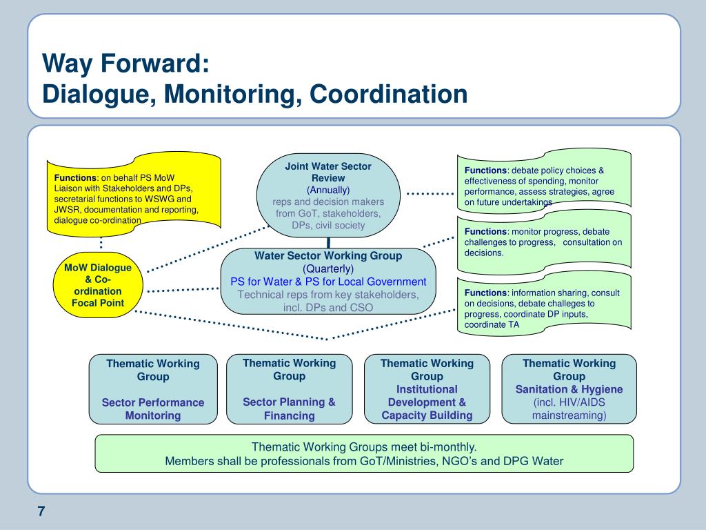 Functions: debate policy choices & effectiveness of spending, monitor performance, assess strategies, agree on future undertakings Functions: on behalf PS MoW Liaison with Stakeholders and DPs, secretarial functions to WSWG and JWSR, documentation and reporting, dialogue co-ordination Joint Water Sector Review (Annually) reps and decision makers from GoT, stakeholders, DPs, civil society Functions: monitor progress, debate challenges to progress, consultation on decisions. Water Sector Working Group (Quarterly) PS for Water & PS for Local Government Technical reps from key stakeholders, incl. DPs and CSO MoW Dialogue & Co-ordination Focal Point Functions: information sharing, consult on decisions, debate challeges to progress, coordinate DP inputs, coordinate TA Thematic Working Group Sector Performance Monitoring Thematic Working Group Sector Planning & Financing Thematic Working Group Institutional Development & Capacity Building Thematic Working Group Sanitation & Hygiene (incl. HIV/AIDS mainstreaming) Thematic Working Groups meet bi-monthly. Members shall be professionals from GoT/Ministries, NGO’s and DPG Water Way Forward: Dialogue, Monitoring, Coordination