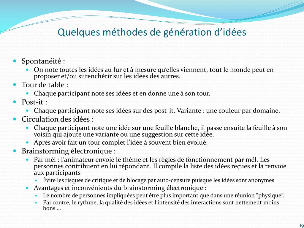 Quelques méthodes de génération d’idées • Spontanéité : • On note toutes les idées au fur et à mesure qu’elles viennent, tout le monde peut en proposer et/ou surenchérir sur les idées des autres. • Tour de table : • Chaque participant note ses idées et en donne une à son tour. • Post-it : • Chaque participant note ses idées sur des post-it. Variante : une couleur par domaine. • Circulation des idées : • Chaque participant note une idée sur une feuille blanche, il passe ensuite la feuille à son voisin qui ajoute une variante ou une suggestion sur cette idée. • Après avoir fait un tour complet l’idée à souvent bien évolué. • Brainstorming électronique : • Par mél : l’animateur envoie le thème et les règles de fonctionnement par mél. Les personnes contribuent en lui répondant. Il compile la liste des idées reçues et la renvoie aux participants • Évite les risques de critique et de blocage par auto-censure puisque les idées sont anonymes • Avantages et inconvénients du brainstorming électronique : • Le nombre de personnes impliquées peut être plus important que dans une réunion “physique”. • Par contre, le rythme, la qualité des idées et l’intensité des interactions sont nettement moins bons …