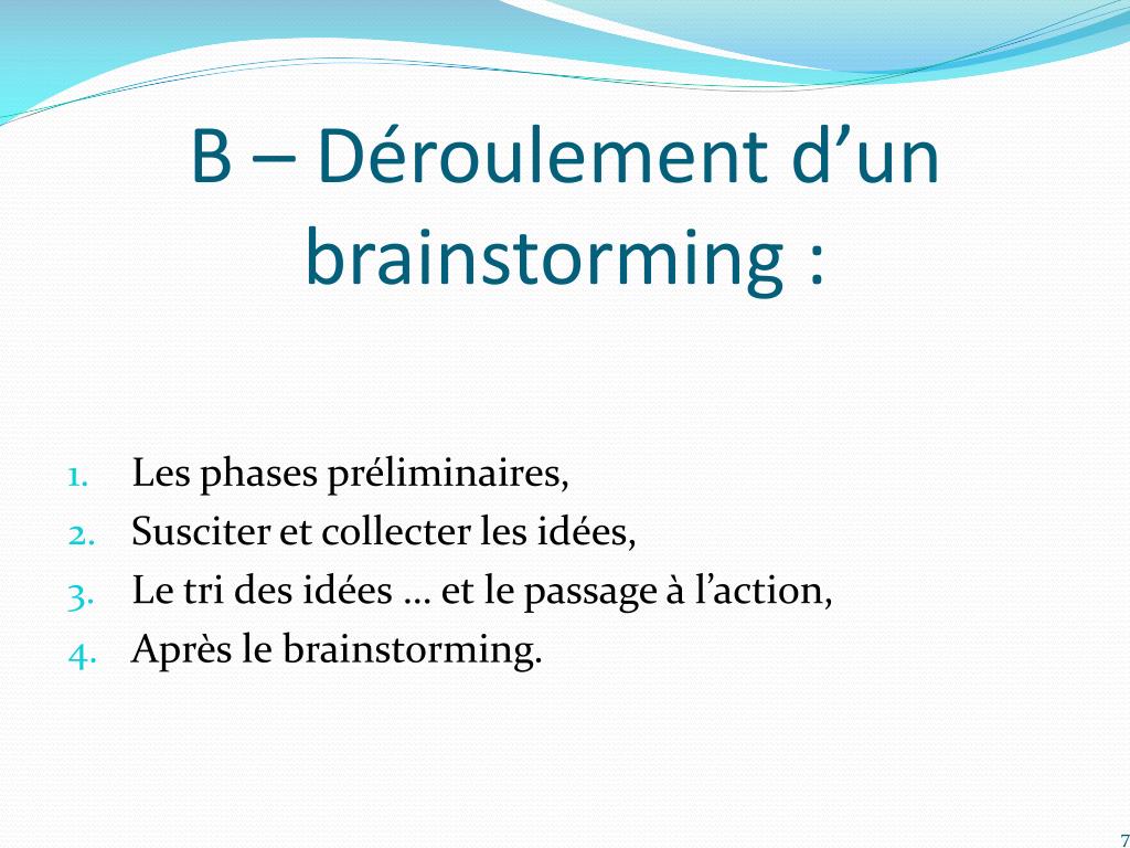 B – Déroulement d’un brainstorming : • Les phases préliminaires, • Susciter et collecter les idées, • Le tri des idées … et le passage à l’action, • Après le brainstorming.