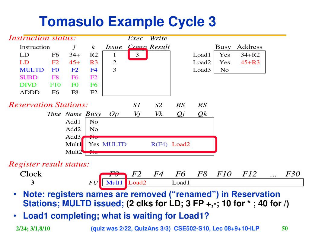 Tomasulo Example Cycle 2 Note: Can have multiple loads outstanding (quiz was 2/22, QuizAns 3/3) CSE502-S10, Lec 08+9+10-ILP