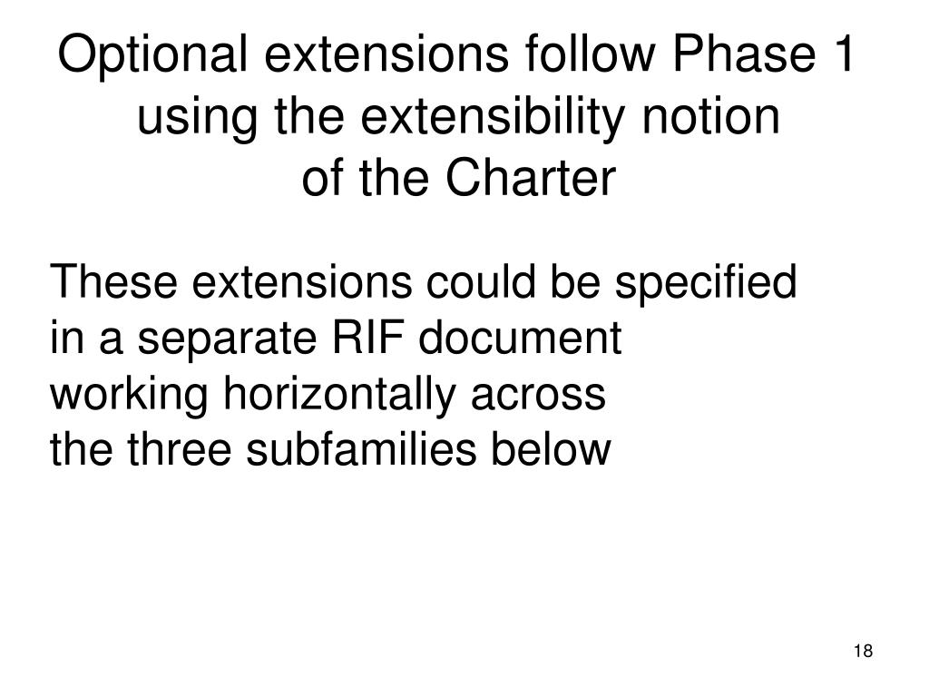 Optional extensions follow Phase 1 using the extensibility notionof the Charter These extensions could be specified in a separate RIF document working horizontally across the three subfamilies below
