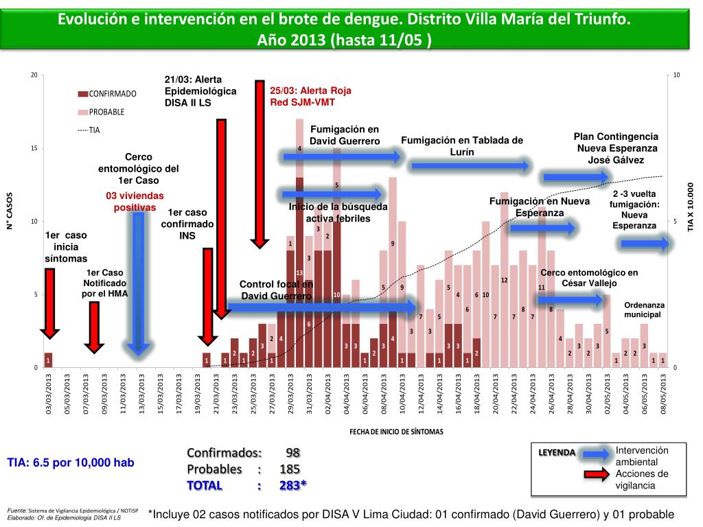 Evolución e intervención en el brote de dengue. Distrito Villa María del Triunfo. Año 2013 (hasta 11/05 ) 25/03: Alerta Roja Red SJM-VMT 2 -3 vuelta fumigación: Nueva Esperanza 21/03: Alerta Epidemiológica DISA II LS Plan Contingencia Nueva Esperanza José Gálvez Fumigación en David Guerrero Fumigación en Nueva Esperanza Cerco entomológico en César Vallejo Cerco entomológico del 1er Caso Fumigación en Tablada de Lurín 03 viviendas positivas Inicio de la búsqueda activa febriles 1er caso inicia síntomas 1er caso confirmado INS Control focal en David Guerrero 1er Caso Notificado por el HMA Ordenanza municipal Confirmados: 98 Probables : 185 TOTAL : 283* TIA: 6.5 por 10,000 hab Intervención ambiental Acciones de vigilancia LEYENDA Fuente: Sistema de Vigilancia Epidemiológica / NOTISP Elaborado: Of. de Epidemiologia DISA II LS *Incluye 02 casos notificados por DISA V Lima Ciudad: 01 confirmado (David Guerrero) y 01 probable