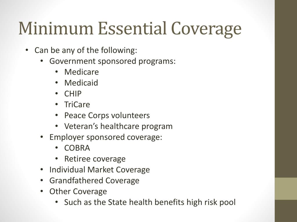 Minimum Essential Coverage • Can be any of the following: • Government sponsored programs: • Medicare • Medicaid • CHIP • TriCare • Peace Corps volunteers • Veteran’s healthcare program • Employer sponsored coverage: • COBRA • Retiree coverage • Individual Market Coverage • Grandfathered Coverage • Other Coverage • Such as the State health benefits high risk pool