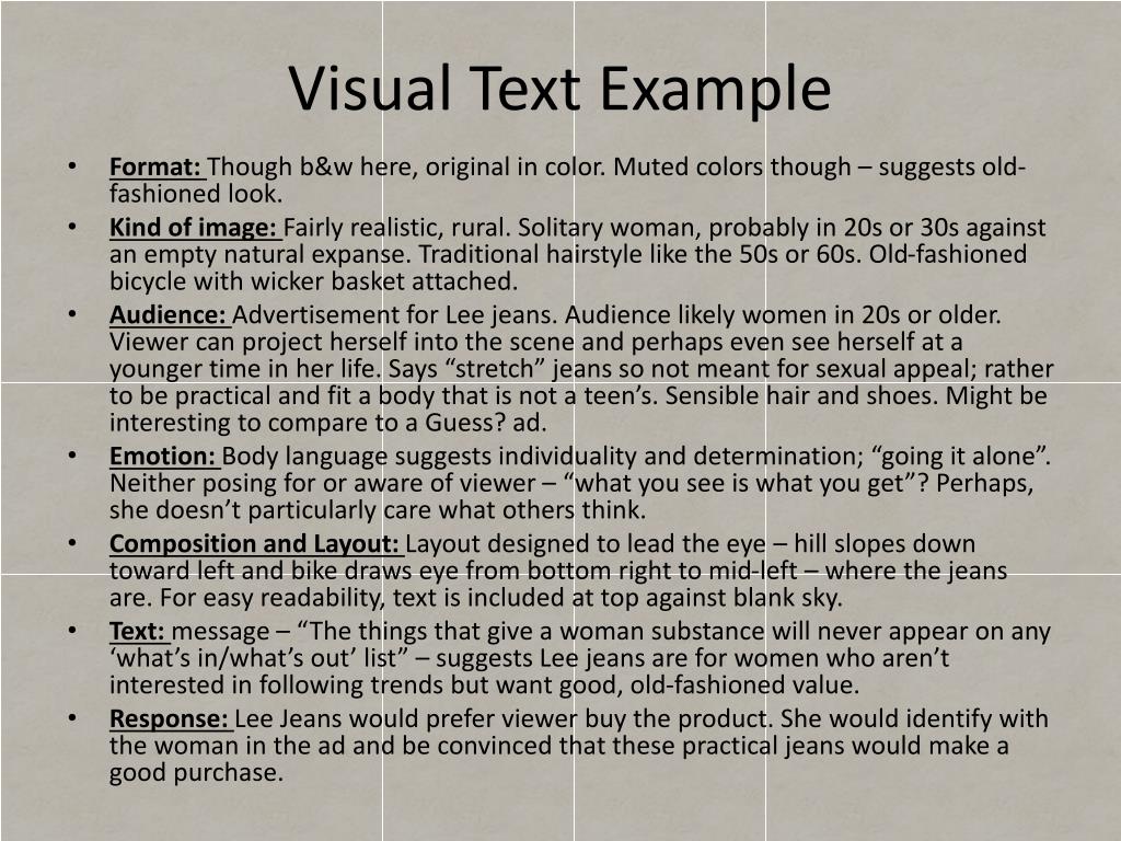 Visual Text Example • Format: Though b&w here, original in color. Muted colors though – suggests old-fashioned look. • Kind of image: Fairly realistic, rural. Solitary woman, probably in 20s or 30s against an empty natural expanse. Traditional hairstyle like the 50s or 60s. Old-fashioned bicycle with wicker basket attached. • Audience: Advertisement for Lee jeans. Audience likely women in 20s or older. Viewer can project herself into the scene and perhaps even see herself at a younger time in her life. Says “stretch” jeans so not meant for sexual appeal; rather to be practical and fit a body that is not a teen’s. Sensible hair and shoes. Might be interesting to compare to a Guess? ad. • Emotion: Body language suggests individuality and determination; “going it alone”. Neither posing for or aware of viewer – “what you see is what you get”? Perhaps, she doesn’t particularly care what others think. • Composition and Layout: Layout designed to lead the eye – hill slopes down toward left and bike draws eye from bottom right to mid-left – where the jeans are. For easy readability, text is included at top against blank sky. • Text: message – “The things that give a woman substance will never appear on any ‘what’s in/what’s out’ list” – suggests Lee jeans are for women who aren’t interested in following trends but want good, old-fashioned value. • Response: Lee Jeans would prefer viewer buy the product. She would identify with the woman in the ad and be convinced that these practical jeans would make a good purchase.