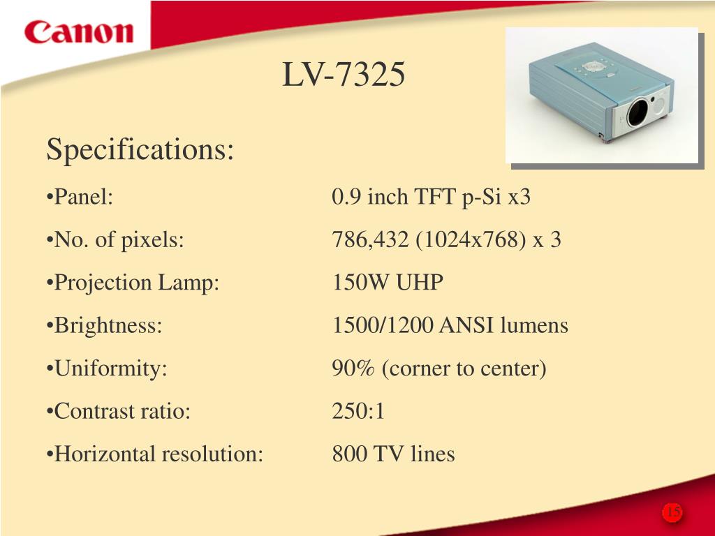 LV-7325 • Specifications: • Panel: 0.9 inch TFT p-Si x3 • No. of pixels: 786,432 (1024x768) x 3 • Projection Lamp: 150W UHP • Brightness: 1500/1200 ANSI lumens • Uniformity: 90% (corner to center) • Contrast ratio: 250:1 • Horizontal resolution: 800 TV lines 15