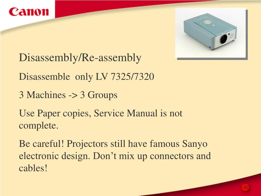 Disassembly/Re-assembly Disassemble only LV 7325/7320 3 Machines -> 3 Groups Use Paper copies, Service Manual is not complete. Be careful! Projectors still have famous Sanyo electronic design. Don’t mix up connectors and cables! 40