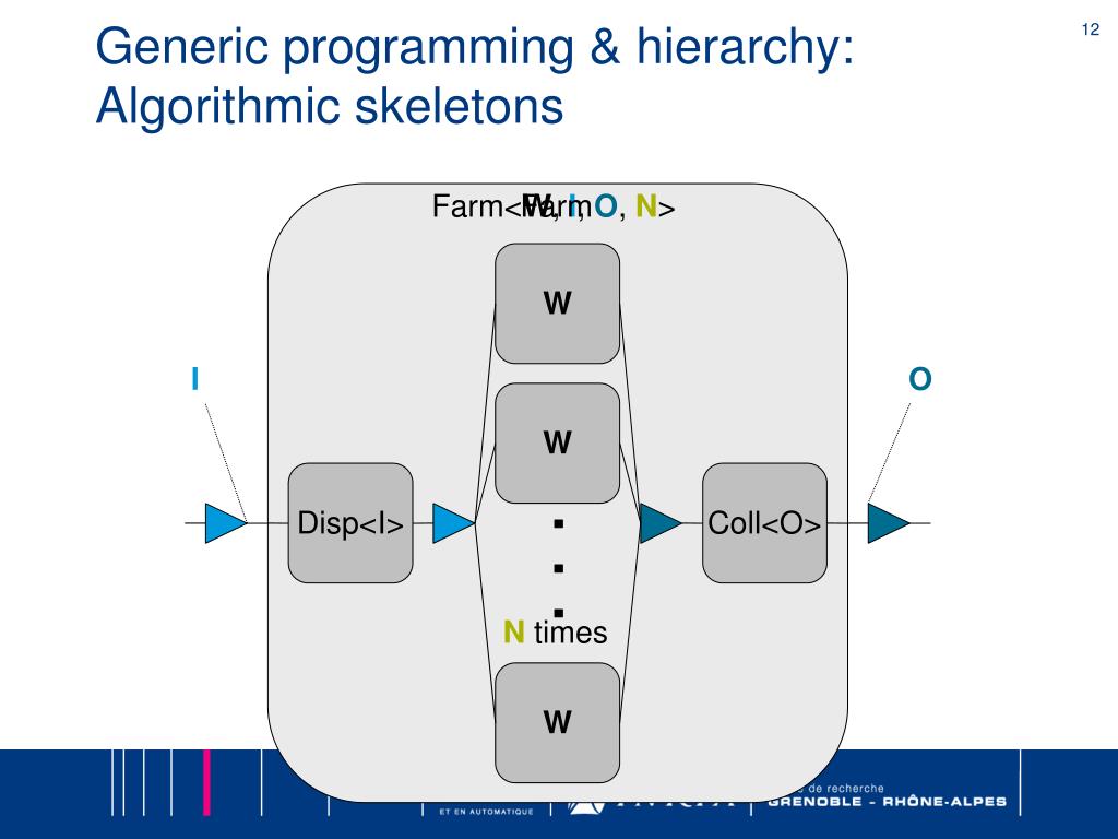 Generic programming & hierarchy:Algorithmic skeletons Farm<W, I, O, N> Farm W I O W Disp<I> Coll<O> . . . N times W