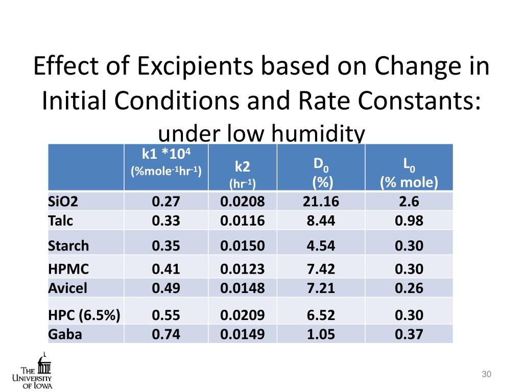 Effect of Excipients based on Change in Initial Conditions and Rate Constants: under low humidity