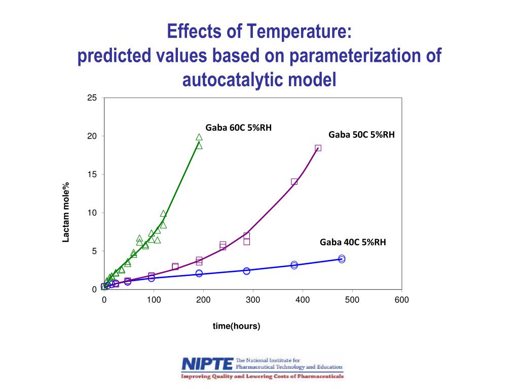 Solid state Degradation Model autocatalytic branching spontaneous dehydration GABA (G) (stable form) GABA (D) (unstable form) LACTAM (L) Hypothesis: Manufacturing stress determines initial conditions (G0, D0 and L0) Environmental (storage) stress determines kinetics (k1, k2 and k3) branching termination