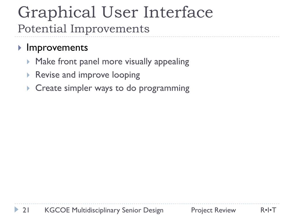 Graphical User InterfacePotential Improvements • Improvements • Make front panel more visually appealing • Revise and improve looping • Create simpler ways to do programming KGCOE Multidisciplinary Senior Design