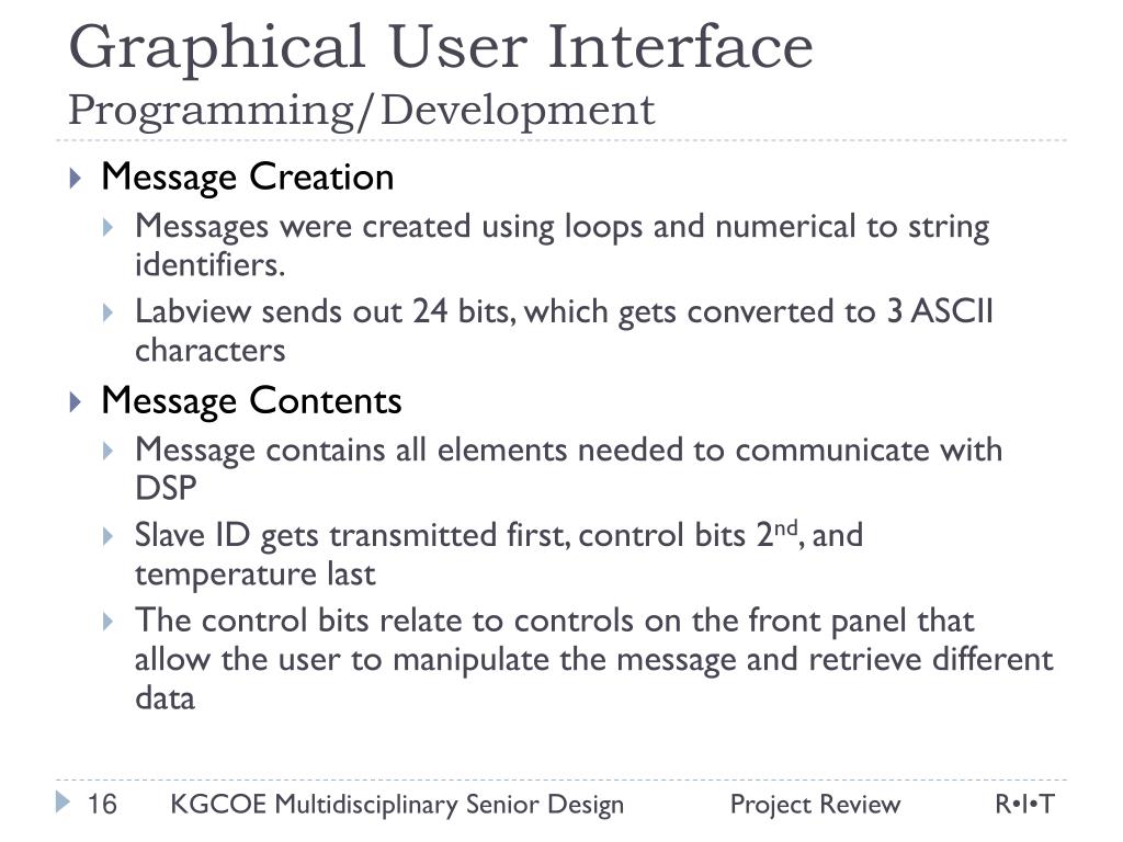 Graphical User InterfaceProgramming/Development • Message Creation • Messages were created using loops and numerical to string identifiers. • Labview sends out 24 bits, which gets converted to 3 ASCII characters • Message Contents • Message contains all elements needed to communicate with DSP • Slave ID gets transmitted first, control bits 2nd, and temperature last • The control bits relate to controls on the front panel that allow the user to manipulate the message and retrieve different data KGCOE Multidisciplinary Senior Design