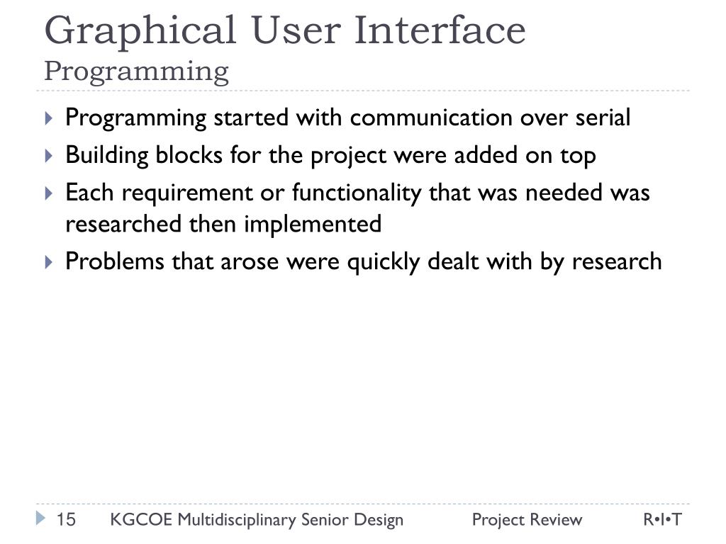 Graphical User InterfaceProgramming • Programming started with communication over serial • Building blocks for the project were added on top • Each requirement or functionality that was needed was researched then implemented • Problems that arose were quickly dealt with by research KGCOE Multidisciplinary Senior Design