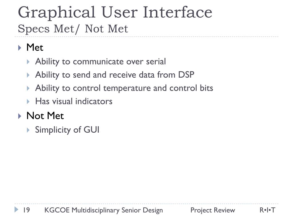 Graphical User InterfaceSpecs Met/ Not Met • Met • Ability to communicate over serial • Ability to send and receive data from DSP • Ability to control temperature and control bits • Has visual indicators • Not Met • Simplicity of GUI KGCOE Multidisciplinary Senior Design
