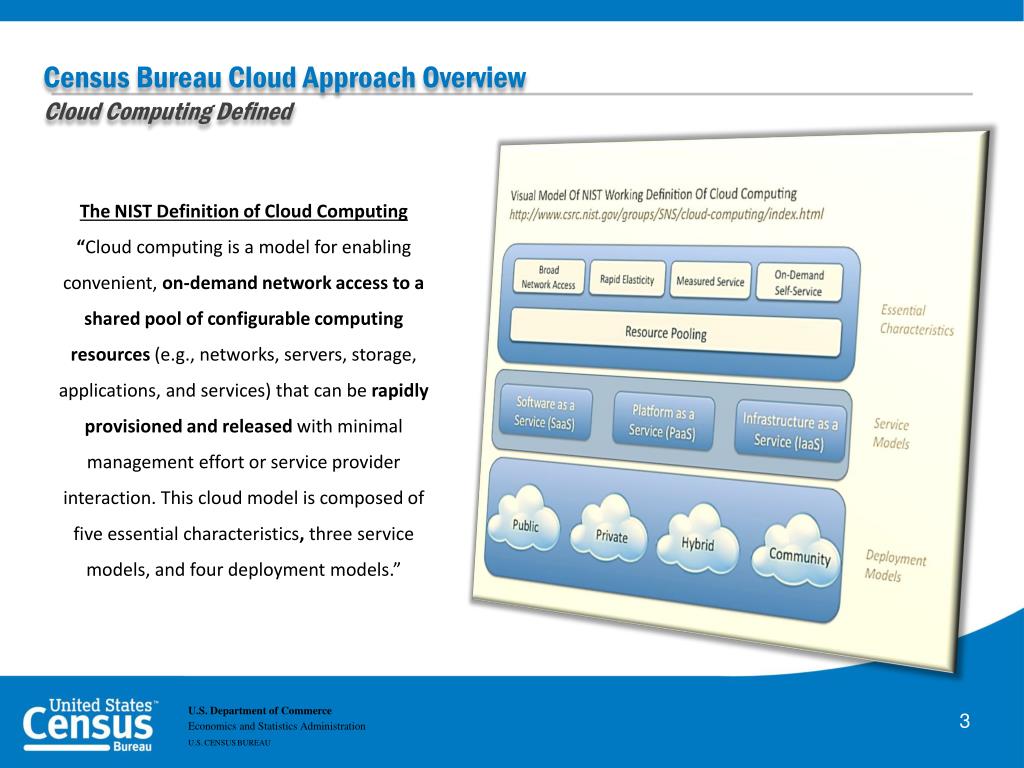 Census Bureau Cloud Approach OverviewCloud Computing Defined The NIST Definition of Cloud Computing “Cloud computing is a model for enabling convenient, on-demand network access to a shared pool of configurable computing resources (e.g., networks, servers, storage, applications, and services) that can be rapidly provisioned and released with minimal management effort or service provider interaction. This cloud model is composed of five essential characteristics, three service models, and four deployment models.” U.S. Department of Commerce Economics and Statistics Administration U.S. CENSUS BUREAU