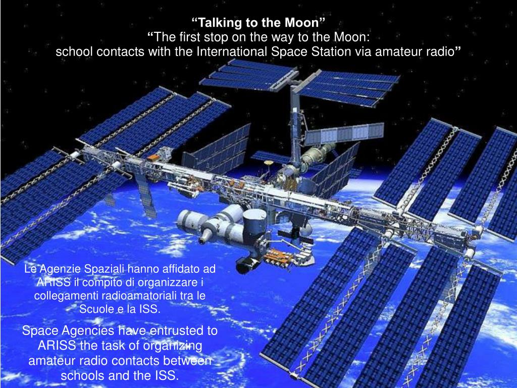 “Talking to the Moon” “The first stop on the way to the Moon: school contacts with the International Space Station via amateur radio” Le Agenzie Spaziali hanno affidato ad ARISS il compito di organizzare i collegamenti radioamatoriali tra le Scuole e la ISS. Space Agencies have entrusted to ARISS the task of organizing amateur radio contacts between schools and the ISS.