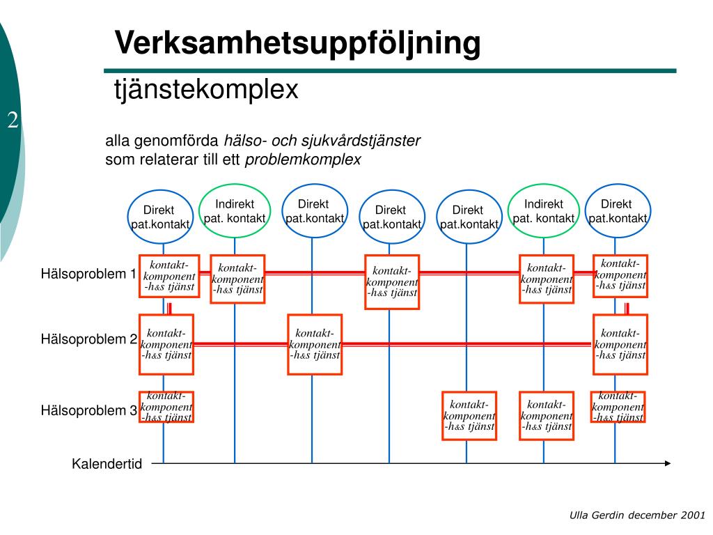 Verksamhetsuppföljningtjänstekomplex 2 alla genomförda hälso- och sjukvårdstjänstersom relaterar till ett problemkomplex Indirektpat. kontakt Direkt pat.kontakt Indirektpat. kontakt Direkt pat.kontakt Direkt pat.kontakt Direkt pat.kontakt Direkt pat.kontakt kontakt-komponent -h&s tjänst kontakt-komponent -h&s tjänst kontakt-komponent -h&s tjänst kontakt-komponent -h&s tjänst kontakt-komponent -h&s tjänst Hälsoproblem 1 kontakt-komponent -h&s tjänst kontakt-komponent -h&s tjänst kontakt-komponent -h&s tjänst Hälsoproblem 2 kontakt-komponent -h&s tjänst kontakt-komponent -h&s tjänst kontakt-komponent -h&s tjänst kontakt-komponent -h&s tjänst Hälsoproblem 3 Kalendertid Ulla Gerdin december 2001
