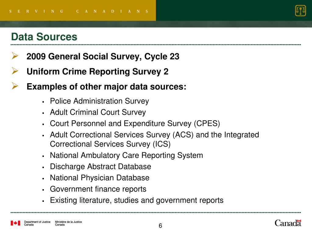 Data Sources • 2009 General Social Survey, Cycle 23 • Uniform Crime Reporting Survey 2 • Examples of other major data sources: • Police Administration Survey • Adult Criminal Court Survey • Court Personnel and Expenditure Survey (CPES) • Adult Correctional Services Survey (ACS) and the Integrated Correctional Services Survey (ICS) • National Ambulatory Care Reporting System • Discharge Abstract Database • National Physician Database • Government finance reports • Existing literature, studies and government reports