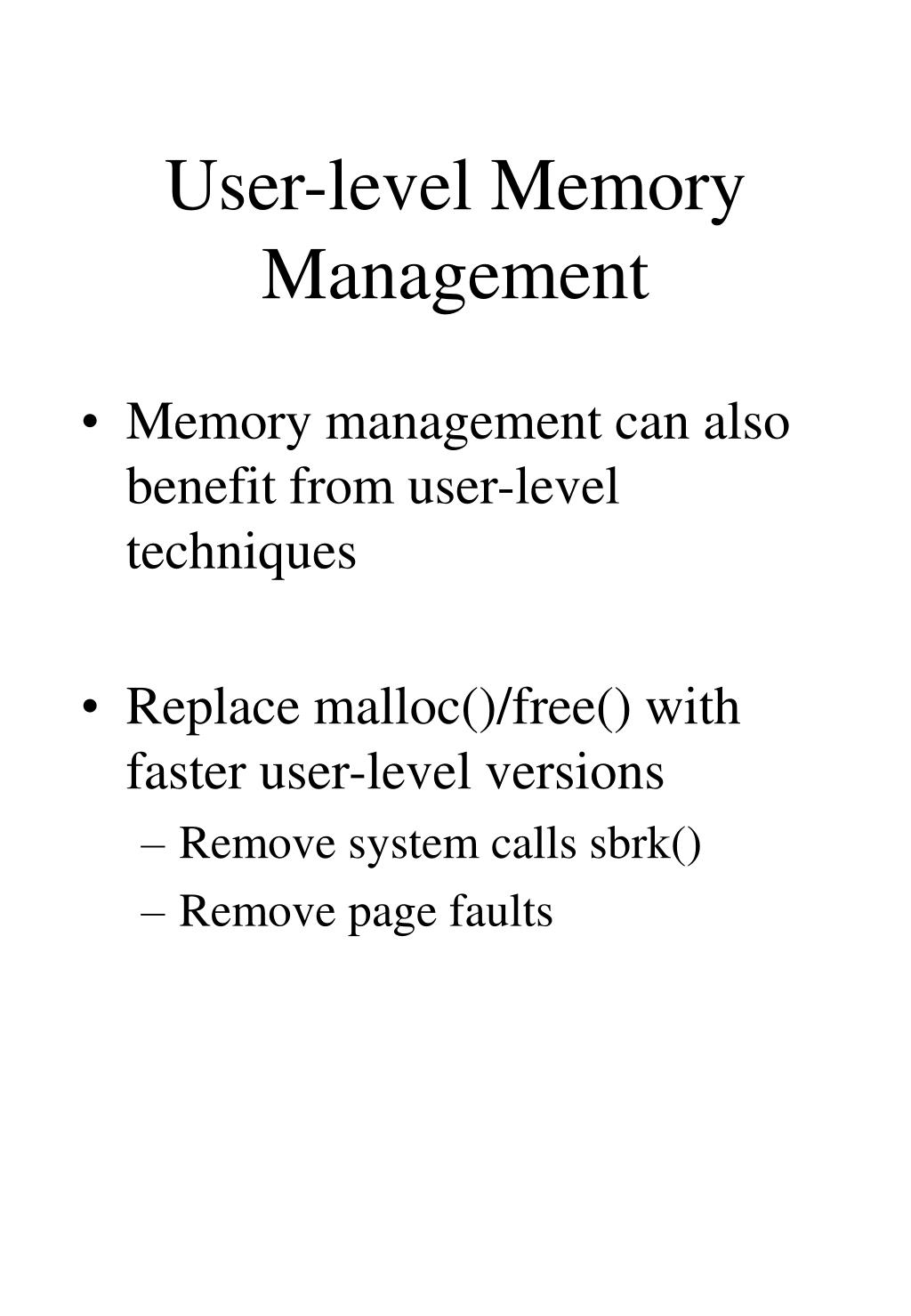 User-level Memory Management • Memory management can also benefit from user-level techniques • Replace malloc()/free() with faster user-level versions • Remove system calls sbrk() • Remove page faults
