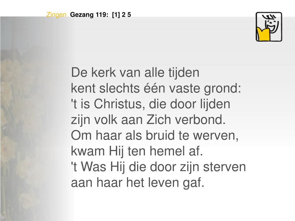 Zingen Gezang 119: [1] 2 5 De kerk van alle tijden kent slechts één vaste grond: 't is Christus, die door lijden zijn volk aan Zich verbond. Om haar als bruid te werven, kwam Hij ten hemel af. 't Was Hij die door zijn sterven aan haar het leven gaf.