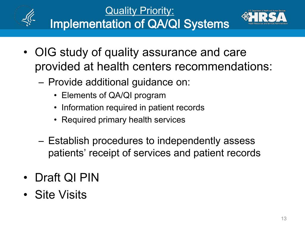 Quality Priority:Implementation of QA/QI Systems • OIG study of quality assurance and care provided at health centers recommendations: • Provide additional guidance on: • Elements of QA/QI program • Information required in patient records • Required primary health services • Establish procedures to independently assess patients’ receipt of services and patient records • Draft QI PIN • Site Visits