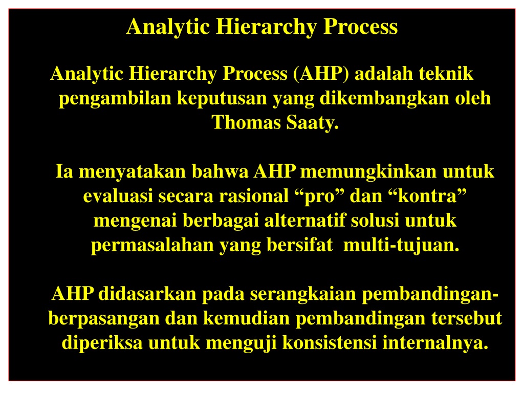 Analytic Hierarchy Process Analytic Hierarchy Process (AHP) adalah teknik pengambilan keputusan yang dikembangkan oleh Thomas Saaty. Ia menyatakanbahwaAHP memungkinkan untuk evaluasi secararasional “pro” dan “kontra” mengenai berbagaialternatif solusiuntuk permasalahan yang bersifat multi-tujuan. AHP didasarkan pada serangkaian pembandingan-berpasangan dan kemudian pembandingan tersebutdiperiksa untuk mengujikonsistensi internalnya.