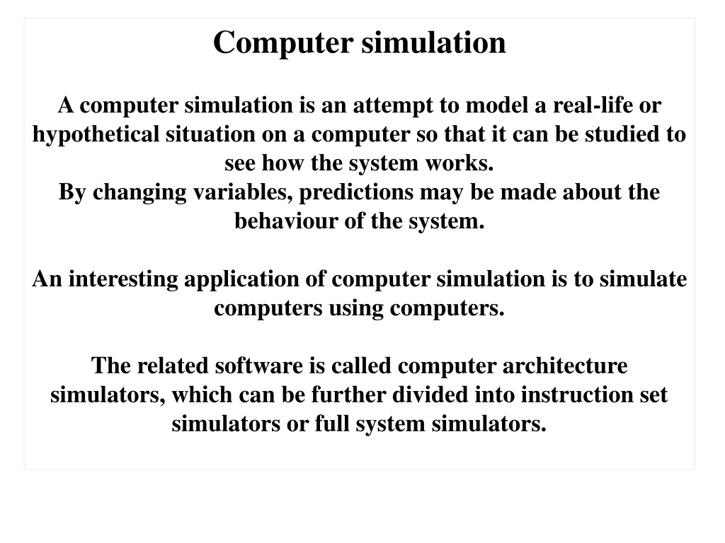 Computer simulation A computer simulation is an attempt to model a real-life or hypothetical situation on a computer so that it can be studied to see how the system works. By changing variables, predictions may be made about the behaviour of the system. An interesting application of computer simulation is to simulate computers using computers. The related software is called computer architecture simulators, which can be further divided into instruction set simulators or full system simulators.