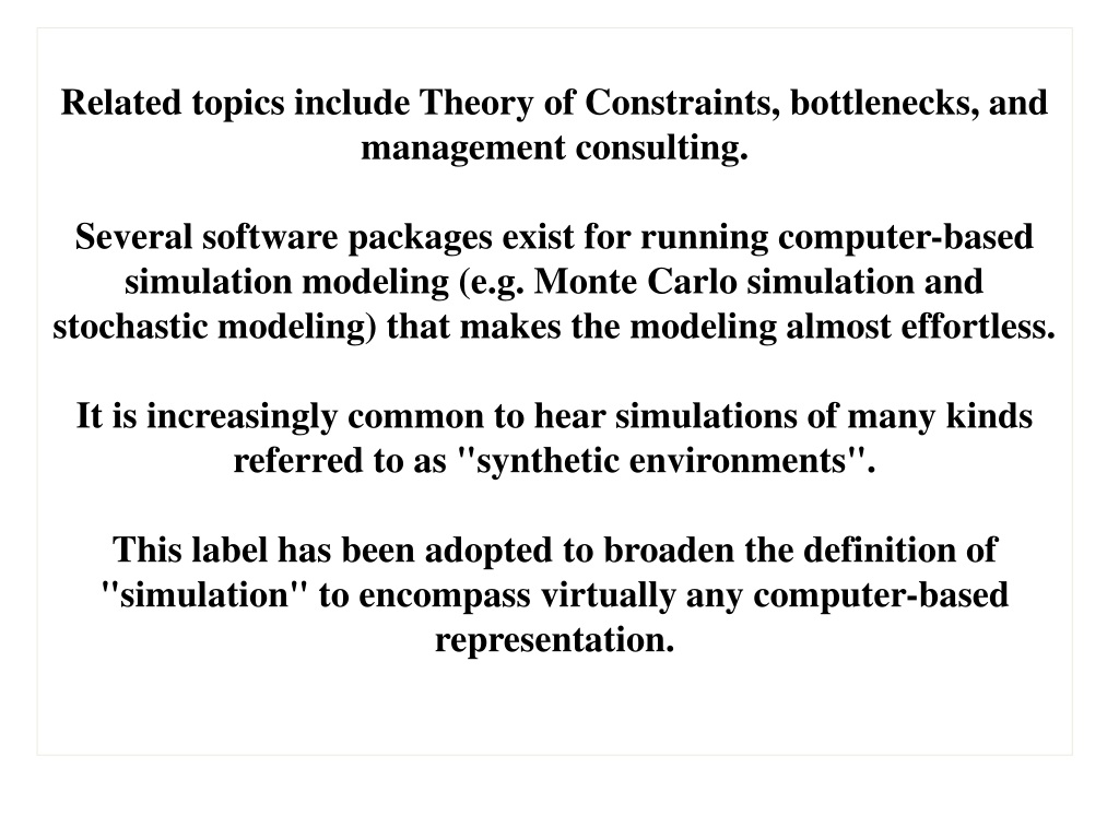Related topics include Theory of Constraints, bottlenecks, and management consulting. Several software packages exist for running computer-based simulation modeling (e.g. Monte Carlo simulation and stochastic modeling) that makes the modeling almost effortless. It is increasingly common to hear simulations of many kinds referred to as "synthetic environments". This label has been adopted to broaden the definition of "simulation" to encompass virtually any computer-based representation.