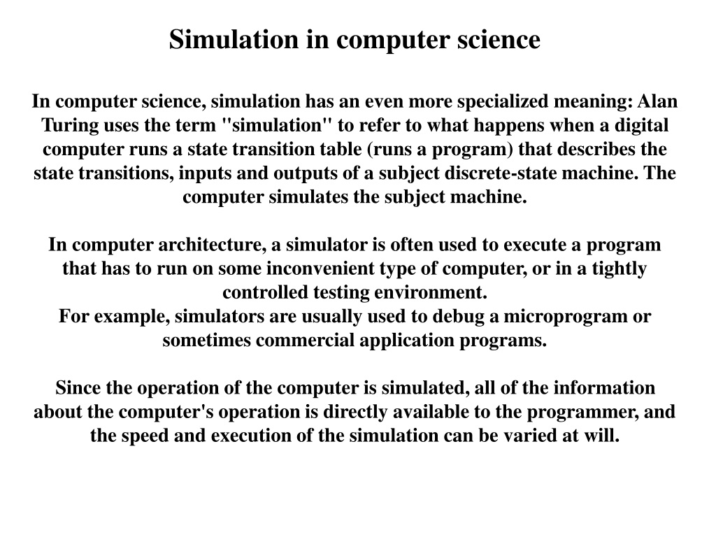 Simulation in computer science In computer science, simulation has an even more specialized meaning: Alan Turing uses the term "simulation" to refer to what happens when a digital computer runs a state transition table (runs a program) that describes the state transitions, inputs and outputs of a subject discrete-state machine. The computer simulates the subject machine. In computer architecture, a simulator is often used to execute a program that has to run on some inconvenient type of computer, or in a tightly controlled testing environment. For example, simulators are usually used to debug a microprogram or sometimes commercial application programs. Since the operation of the computer is simulated, all of the information about the computer's operation is directly available to the programmer, and the speed and execution of the simulation can be varied at will.