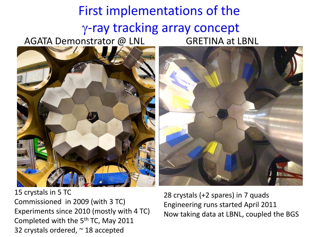 First implementations of theg-ray tracking array concept AGATA Demonstrator @ LNL GRETINA at LBNL 15 crystals in 5 TC Commissioned in 2009 (with 3 TC) Experiments since 2010 (mostly with 4 TC) Completed with the 5th TC, May 2011 32 crystals ordered, ~ 18 accepted 28 crystals (+2 spares) in 7 quads Engineering runs started April 2011 Now taking data at LBNL, coupled the BGS