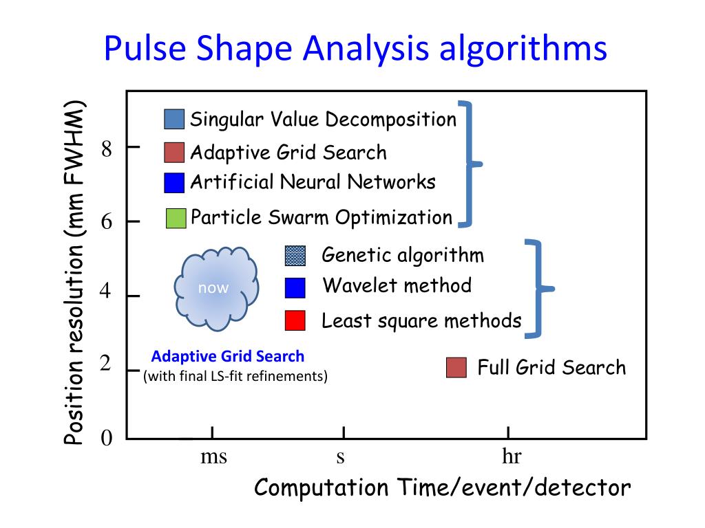 Pulse Shape Analysis algorithms Singular Value Decomposition 8 Adaptive Grid Search Artificial Neural Networks Particle Swarm Optimization 6 Genetic algorithm now Position resolution (mm FWHM) Wavelet method 4 Least square methods Adaptive Grid Search(with final LS-fit refinements) 2 Full Grid Search 0 ms s hr Computation Time/event/detector