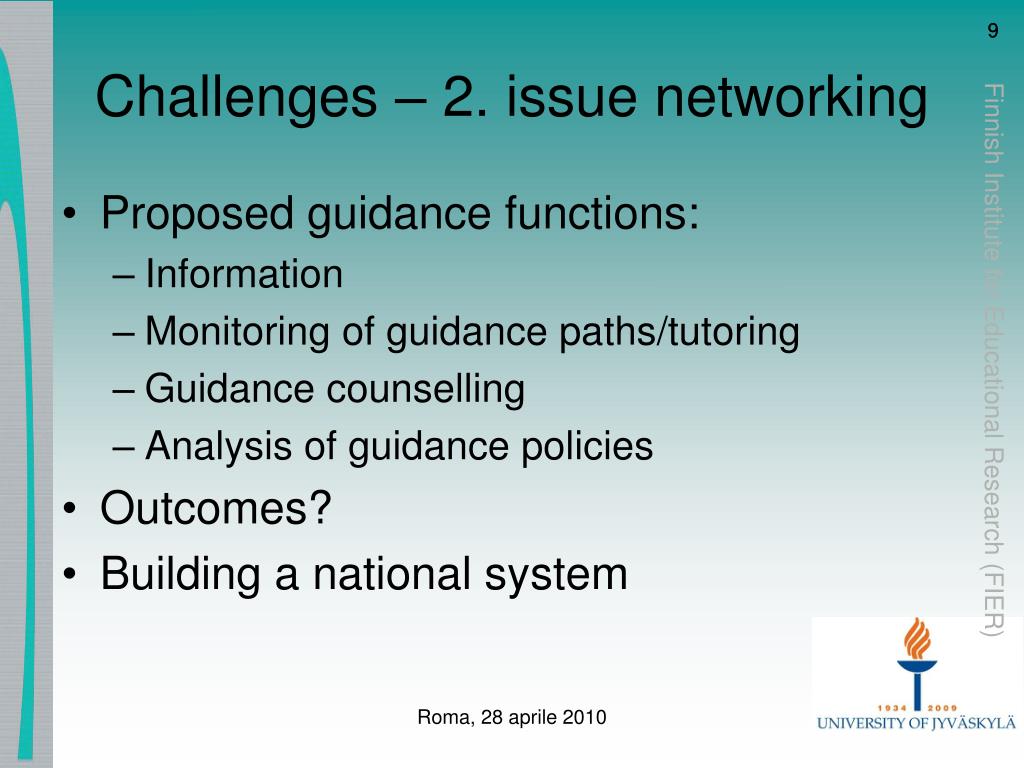 Challenges – 2. issue networking 9 • Proposed guidance functions: • Information • Monitoring of guidance paths/tutoring • Guidance counselling • Analysis of guidance policies • Outcomes? • Building a national system Roma, 28 aprile 2010