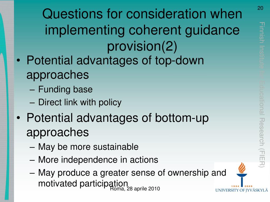 Questions for consideration when implementing coherent guidance provision(2) Potential advantages of top-down approaches Funding base Direct link with policy Potential advantages of bottom-up approaches May be more sustainable More independence in actions May produce a greater sense of ownership and motivated participation Roma, 28 aprile 2010