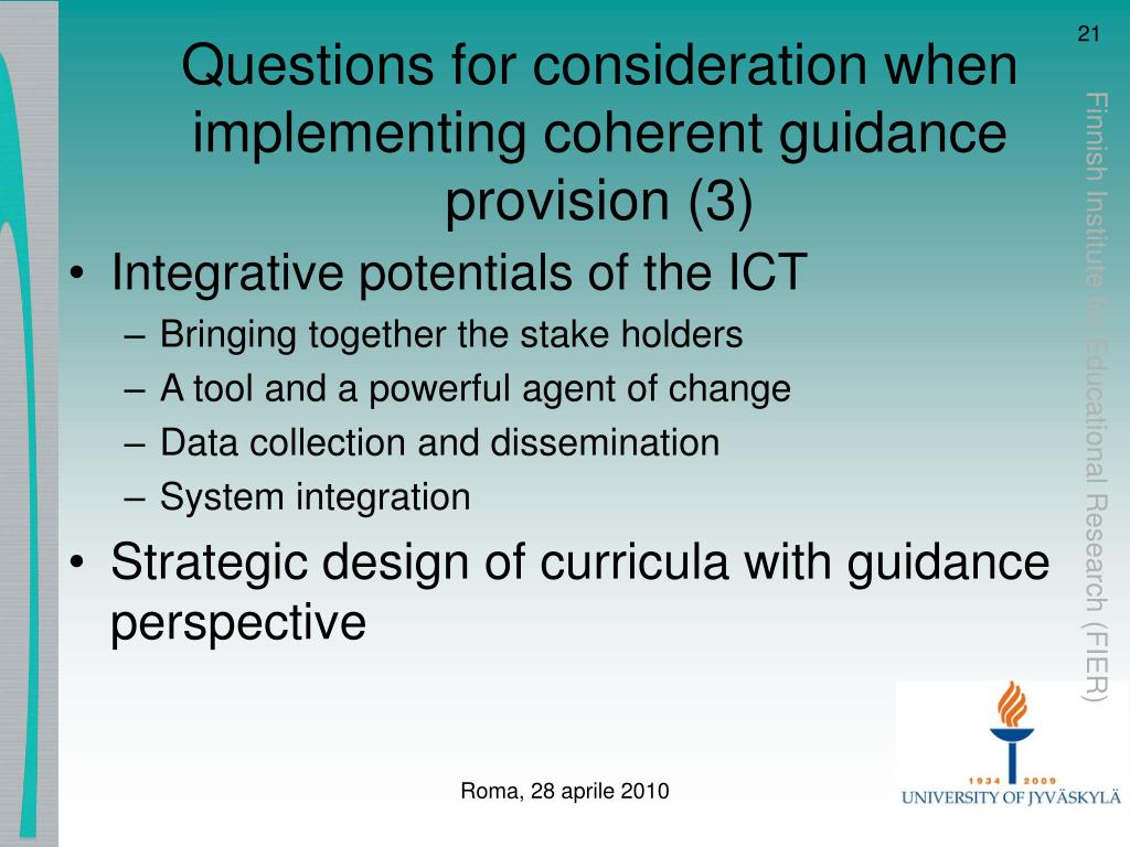 Questions for consideration when implementing coherent guidance provision (3) Integrative potentials of the ICT Bringing together the stake holders A tool and a powerful agent of change Data collection and dissemination System integration Strategic design of curricula with guidance perspective Roma, 28 aprile 2010
