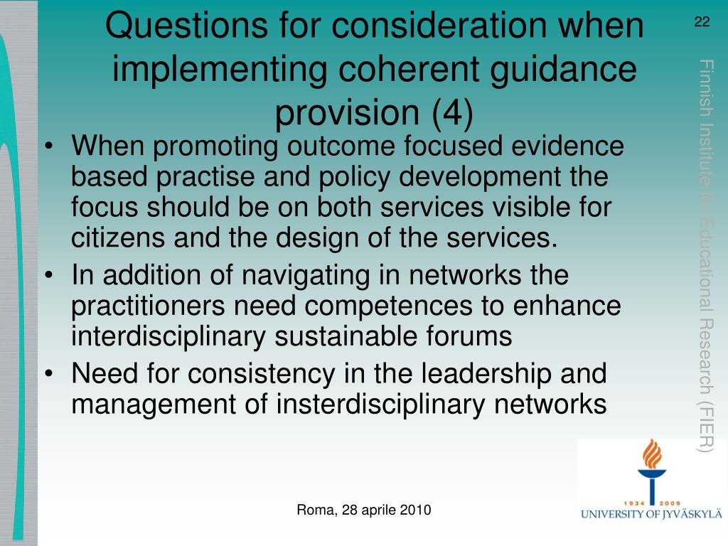 Questions for consideration when implementing coherent guidance provision (4) When promoting outcome focused evidence based practise and policy development the focus should be on both services visible for citizens and the design of the services. In addition of navigating in networks the practitioners need competences to enhance interdisciplinary sustainable forums Need for consistency in the leadership and management of insterdisciplinary networks Roma, 28 aprile 2010