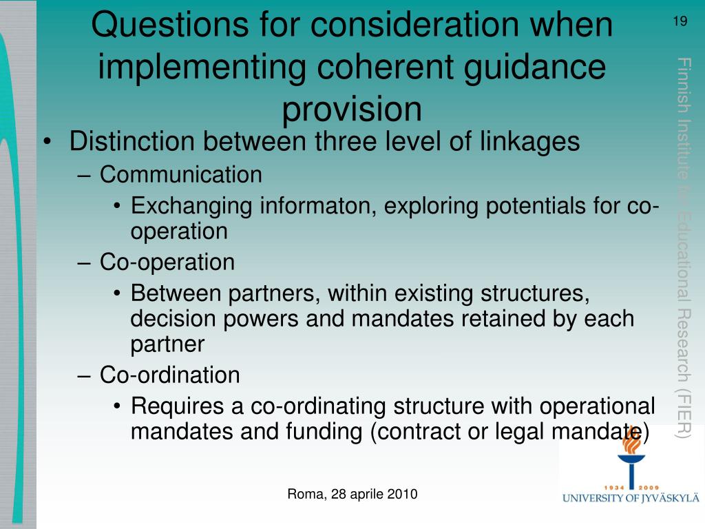 Questions for consideration when implementing coherent guidance provision Distinction between three level of linkages Communication Exchanging informaton, exploring potentials for co-operation Co-operation Between partners, within existing structures, decision powers and mandates retained by each partner Co-ordination Requires a co-ordinating structure with operational mandates and funding (contract or legal mandate) Roma, 28 aprile 2010