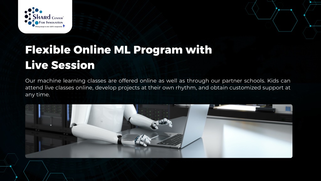 Flexible Online ML Program with Live Session Our machine learning classes are offered online as well as through our partner schools. Kids can attend live classes online, develop projects at their own rhythm, and obtain customized support at any time.