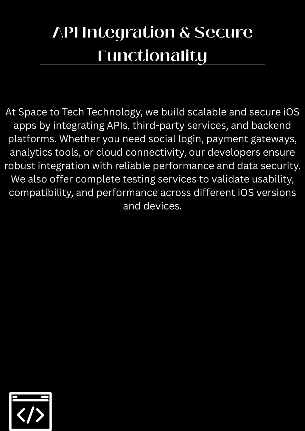 API Integration & Secure Functionality At Space to Tech Technology, we build scalable and secure iOS apps by integrating APIs, third-party services, and backend platforms. Whether you need social login, payment gateways, analytics tools, or cloud connectivity, our developers ensure robust integration with reliable performance and data security. We also offer complete testing services to validate usability, compatibility, and performance across different iOS versions and devices.