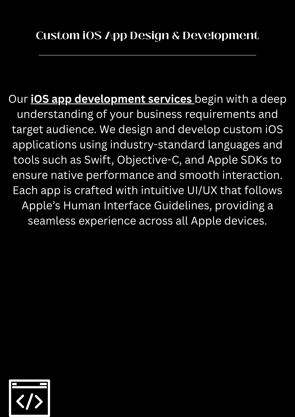 Custom iOS App Design & Development Our iOS app development services begin with a deep understanding of your business requirements and target audience. We design and develop custom iOS applications using industry-standard languages and tools such as Swift, Objective-C, and Apple SDKs to ensure native performance and smooth interaction. Each app is crafted with intuitive UI/UX that follows Apple’s Human Interface Guidelines, providing a seamless experience across all Apple devices.