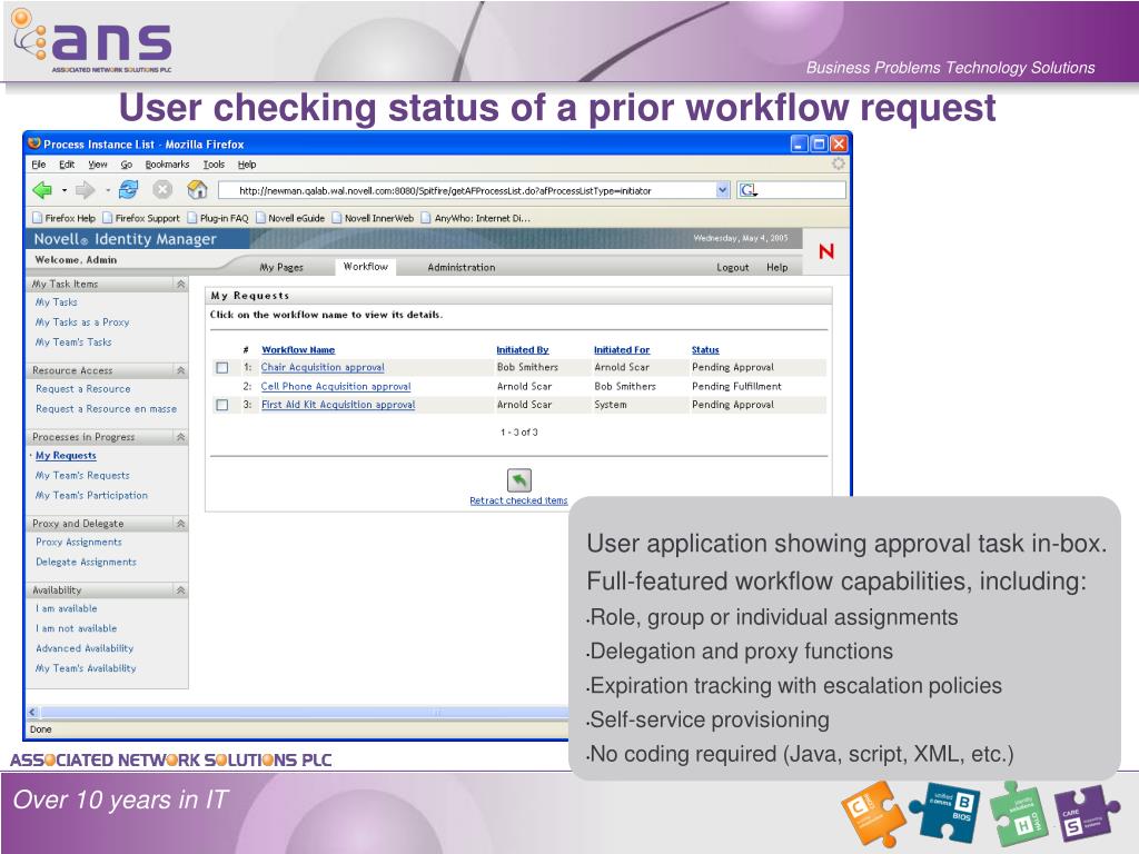 User checking status of a prior workflow request User application showing approval task in-box. Full-featured workflow capabilities, including: • Role, group or individual assignments • Delegation and proxy functions • Expiration tracking with escalation policies • Self-service provisioning • No coding required (Java, script, XML, etc.)