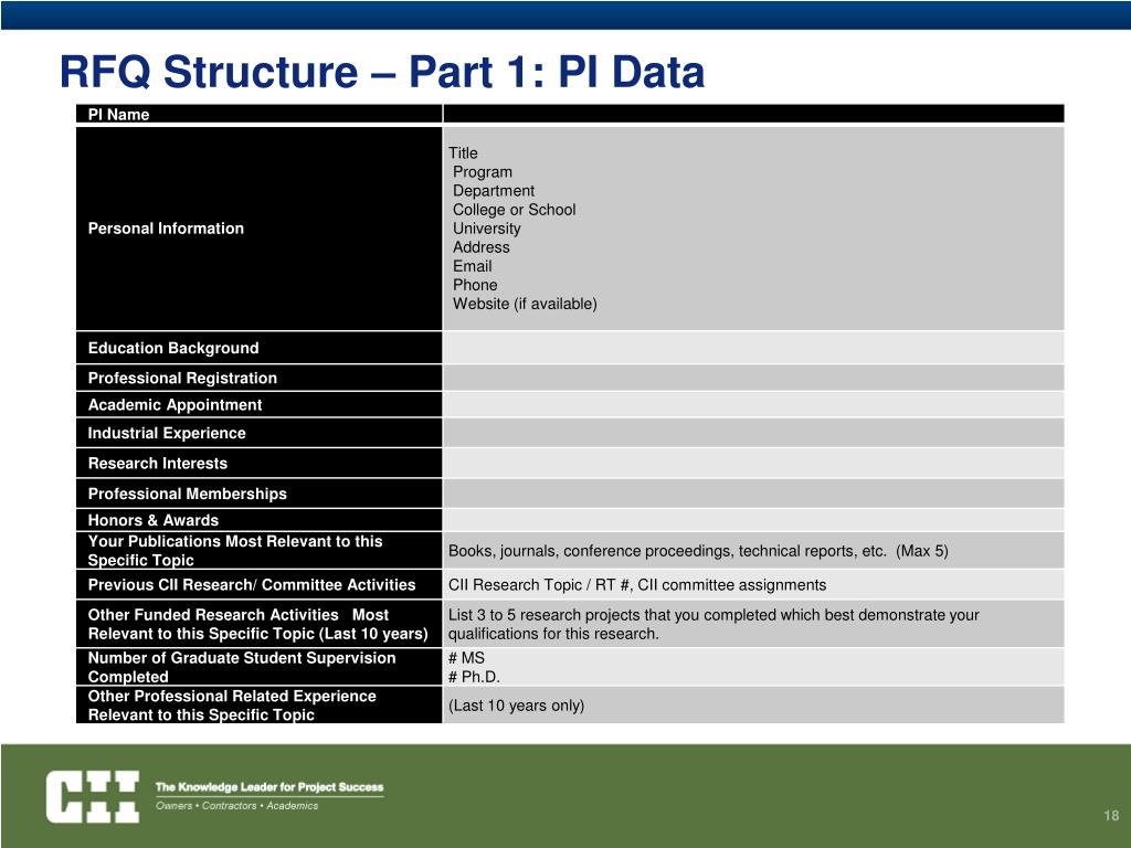 RFQ Structure • Purpose • To efficiently organize data for submittal & evaluation • Who may submit Qualifications • Any faculty member from an accredited university may submit qualifications as a PI; they should be on CII’s proposal list • Questions and Submittal Contacts: