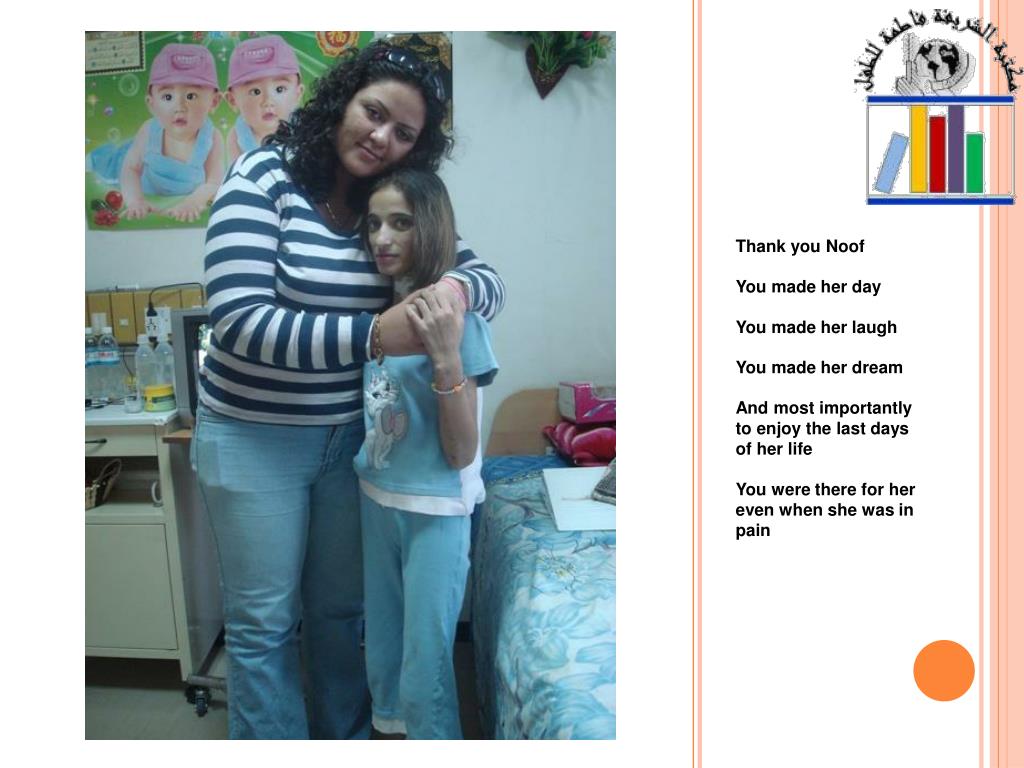 Thank you Noof You made her day You made her laugh You made her dream And most importantly to enjoy the last days of her life You were there for her even when she was in pain